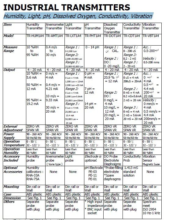 Industrial transmitters (Humidity, Light, pH, Dissolved Oxygen, Conductivity, Vibration, Pressure)