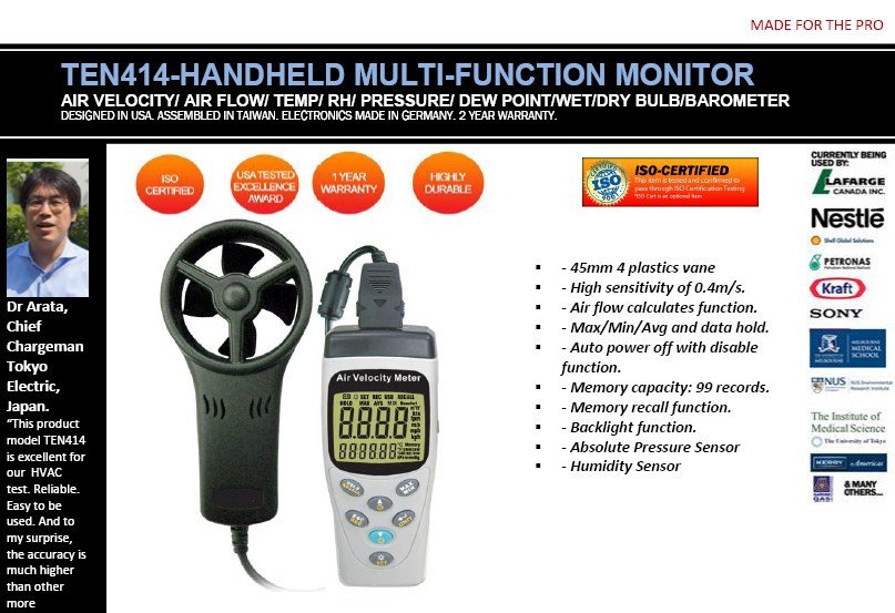 Featured item TEN414-MULTIFUNCTION ANEMOMETER/ AIRFLOW METER - VELOCITY/FLOW/ TEMP/RH/PRESSURE/DATALOG