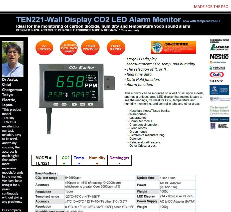 This monitor can be mounted on a wall or sat upon a desk, and has a unique, large LED display that makes it easy to see the readings, it’s ideal for CO2, temperature and humidity monitoring, and control in labs and other areas:
