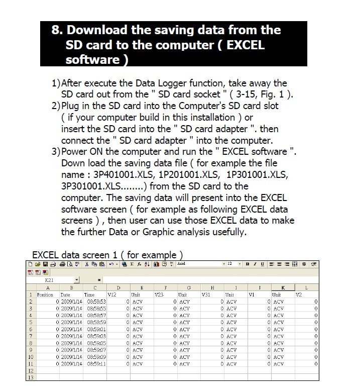 •Built-in clock and Calendar, real time data record with SD memory card , sampling time set from 2 to 7200 seconds. Just slot in the SD card into the computer, it can down load the all the measured value with the time information ( year/month/data/hour/mimute/second ) to the Excel directly, then user can make the further data analysis by themselves.